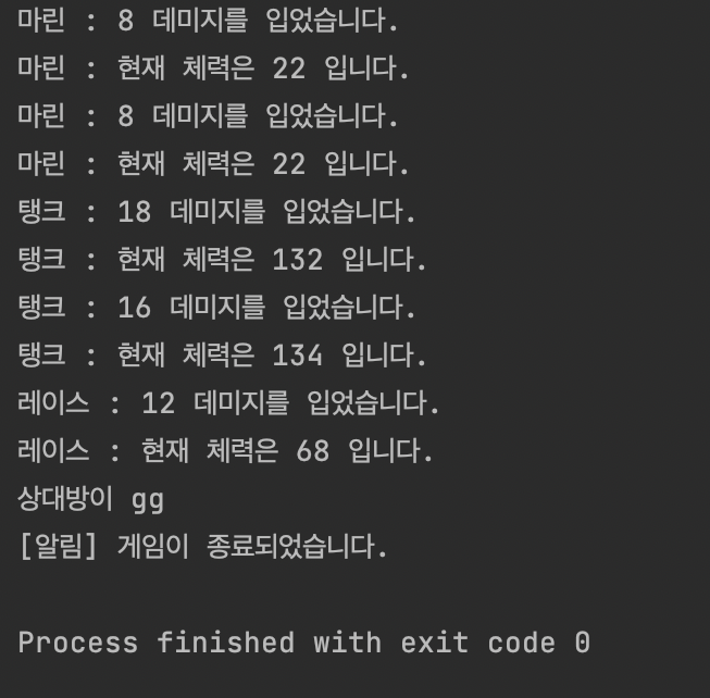 print("{0} : {1} 데미지를 입었습니다.".format(self.name, damage))
